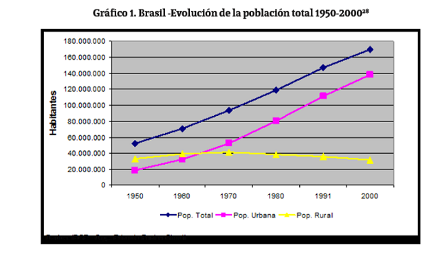 Tal afirmación es demostrada por los datos referentes a la evolución de la población brasileña y su constante urbanización a partir de la década de 1960, visibles en el Gráfico 1.