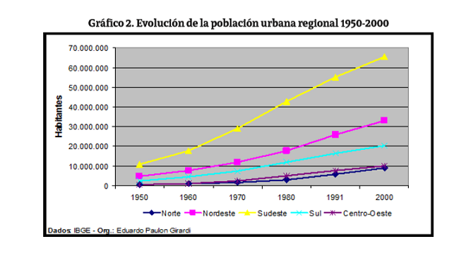 Es notable como la brecha poblacional campo-ciudad se acentúa a partir de la mitad de la década de 1960, periodo que confluye con la ascensión al poder del gobierno militar en 1964. También queda patente el proceso de migración y concentración de la población hacia los grandes centros urbanos del Sudeste del país, con especial énfasis a la región metropolitana de São Paulo; no por acaso centro que capitaneó el proceso de industrialización, datos visibles en los gráficos 2 y 3 a seguir: