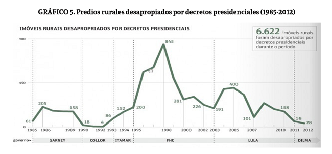 Parte de las frustraciones con la política agraria del gobierno del PT (2003-2016) están influenciadas primeramente por la envergadura tomada por el agronegocio en los últimos años, representando una parte central de la balanza comercial brasileña (y de la base política partidaria que sostuvo al lulismo de 2005 a 2016) en una coyuntura de alza internacional de los precios mundiales de los commodities. Por otro lado, las políticas económicas adoptadas por el gobierno de Lula (una suerte de neodesarrollismo-neoextractivista) que, aun aumentando el gasto social y frenando en parte el proceso de privatización llevado a cabo en el periodo neoliberal de los 90, no operó cambios significativos en materia de política macroeconómica; lo que, en relación a la estructura agraria, significó una constante expulsión de campesinos y concentración de tierras, retrocesos que en parte fueron compensados por una mayor política crediticia a la agricultura familiar y auxilio en la venta de la producción de los asentamientos de la reforma agraria para la gente que sí tenía tierra. Sin embargo, los datos referentes a las desapropiaciones de tierras en todo el periodo posterior a la redemocratización son taxativos en marcar la debilidad de la política agraria del gobierno Lula y de su sucesora Dilma Roussef32 en relación a la reforma agraria (ver gráfico 5 a seguir):