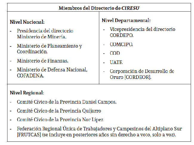 El 15 febrero de 1985, mediante la Ley N° 719, se crea CIRESU, en dicha ley se declara como necesidad nacional la exploración, explotación, beneficio y comercialización de los recursos minerales metálicos y no metálicos, yacentes en la Cuenca Evaporítica del Gran Salar de Uyuni, ubicados en el Departamento de Potosí (Gaceta Oficial, 1985). Por lo que CIRESU se constituía en el representante del Estado para llevar a cabo licitaciones, asociaciones y suscripción de contratos, en las fases de exploración, explotación, beneficio y comercialización de los recursos del Gran Salar de Uyuni (Gaceta Oficial, 1985). El directorio de CIRESU quedó conformado por el Poder Ejecutivo, entidades y organizaciones sociales potosinas.