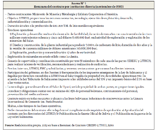 Las negociaciones por invitación directa se iniciaron el 26 de julio de 1988 y el ministro de Minería y Metalurgia, Jaime Villalobos, fue el representante del Estado boliviano. En agosto de ese año se firmó un contrato preliminar entre el Estado y la transnacional norteamericana LITHCO. Orellana (1995) menciona, que este con-trato preliminar produjo fuertes críticas, el ministerio expuso ante una comisión especial de CIRESU y la Comisión de Minería y Metalurgia de la Cámara de Diputados. En ambas comisiones la respuesta de parte del Gobierno fue por motivos técnicos, de mercado, económicos y geopolíticos por los cuales no se continuó con la licitación internacional.14