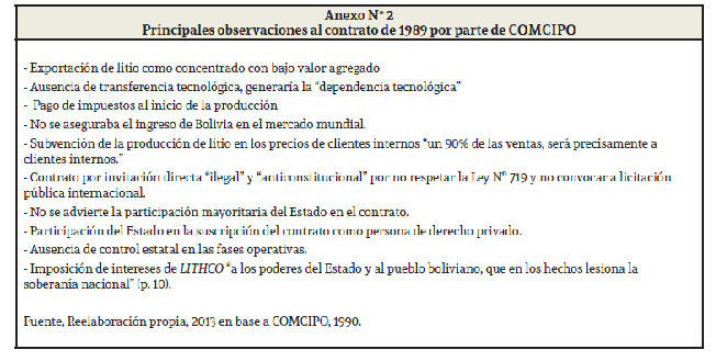Las objeciones de COMCIPO al contrato las hicieron conocer en el documento Análisis del borrador de contrato suscrito entre el Ministerio de Minería y Metalurgia y la Lithium Corporation of América21, en el cual se manifiesta la defensa de los recursos del salar, como también la memoria histórica del extractivismo. Por lo que no querían que se repita la exportación de recursos como materias primas y de bajo valor agregado. Las conclusiones del documento señalaban: el contrato es anticonstitucional, ilegal y lesivo a la soberanía e intereses nacionales. La única forma de considerarlo [...] serían las modificaciones de fondo y de forma, recogiendo las propuestas regionales. En caso contrario, rechazarlo definitivamente y exigir el cumplimiento de la Ley de 15 de febrero de 1985 (COMCIPO, 1990:11).