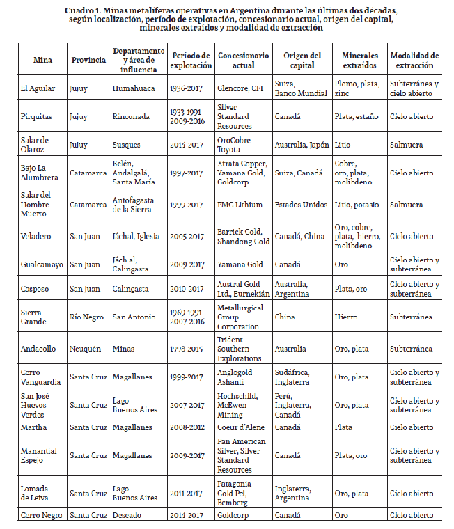 Obstando el indiscutible aporte efectuado por la minería colonial americana a la acumulación primitiva del capital (Marx, 1968; Mandel, 1969), el sector ha desempeñado un papel históricamente marginal en Argentina. Entre la época colonial y finales de la década de 1980 el desarrollo de la actividad permaneció circunscripto a pequeñas explotaciones intermitentes en la Puna, La Rioja, Mendoza, San Luis, San Juan y Chubut. Por envergadura y continuidad, las únicas excepciones fueron El Aguilar y Pirquitas -que entre mediados de la década de 1930 y 1990 convirtieron a Jujuy en la capital nacional de la minería- y Sierra Grande (Río Negro) -la mina de hierro más grande de Sudamérica y único proyecto metalífero surgido por iniciativa estatal-.