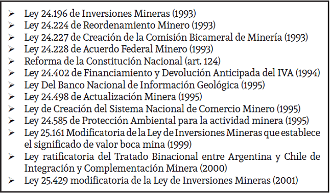 El gobierno de Menem, para ceder a las presiones de las corporaciones trasnacionales mineras, realizó una alianza estratégica con los gobernadores de las provincias que poseían reservas metalíferas. Ese proceso finaliza con la firma del Pacto Federal Minero, en el cual se acordó que las provincias decidían sobre sus recursos naturales. Este pacto se convirtió en la Ley 24.228/93 de Acuerdo Federal Minero cuyas pautas fueron incluidas en la Reforma de la Constitución del año 1994. La Ley le otorga a las Provincias la potestad sobre los recursos mineros y de proceder a llamar a concurso para la exploración y explotación de los mismos. Además ratifica que las Provincias propiciarán la eliminación de aquellos gravámenes y tasa municipales que afecten directamente la actividad minera (Ley 24.228/93).