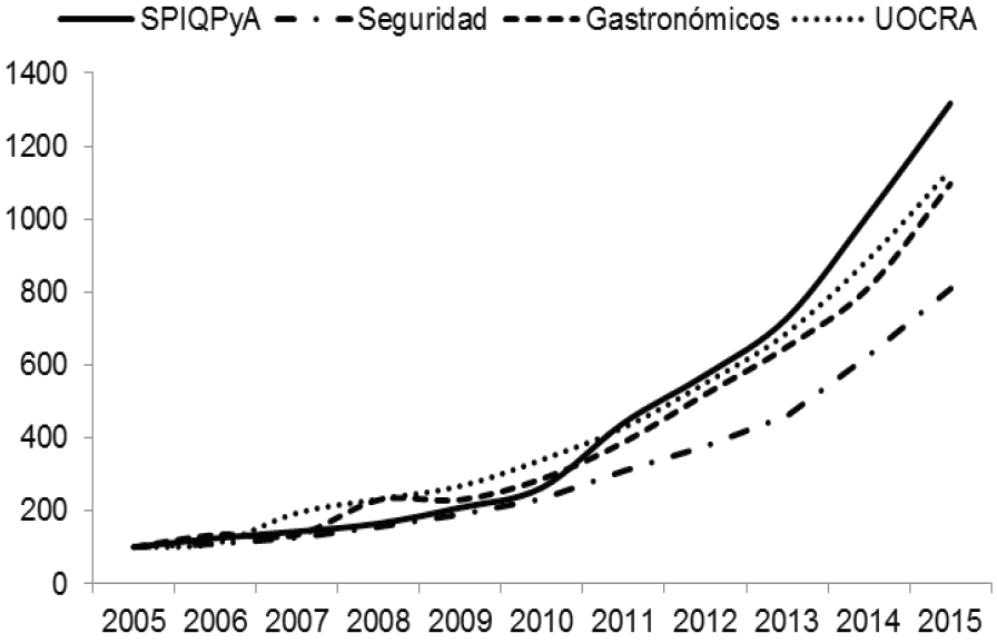 Más allá de lograr reducir la brecha en el nivel de salario inicial, la misma tiende a acentuarse debido a la aplicación de la pauta de actualización conseguida por cada sindicato. El Gráfico 1 muestra la evolución del índice de salario básico para diferentes convenios de actividad que encuadran a trabajadores tercerizados del CPBB (seguridad, gastronómicos y construcción) y los dos convenios por empresa firmados por el SPIQPyA7. Allí se aprecia que hasta el año 2010 los salarios de seguridad y construcción tuvieron una evolución más favorable –coincide con una etapa en la cual a nivel agregado tendió a caer la heterogeneidad salarial-. A partir de allí, la evolución del salario de petroquímicos fue mejor al resto de los convenios analizados8.