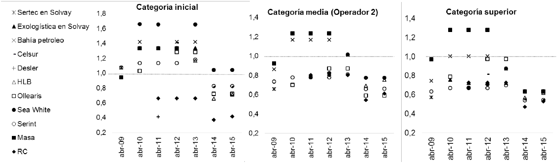 En base a los convenios y las actas firmadas desde aquel entonces es posible analizar las diferencias tanto en el salario básico y como en el salario conformado, es decir, contemplando adicionales y premios, de los trabajadores directos y tercerizados encuadrados en el SPIQPyA. El gráfico 2 muestra el cociente entre el salario básico de aquellas empresas contratistas que se identificó que prestaron o prestan servicios en Indupa y que negocian con el SPIQPyA y el salario básico de los trabajadores directos de esta última. El gráfico 3 expresa esto mismo para el caso de PBB9. En cada gráfico la línea punteada indica que no hay diferencias entre el salario de la empresa principal, y por tanto, los puntos que están por arriba (abajo) corresponden a aquellas empresas contratistas cuyo salario básico, para esa categoría, es superior (inferior) al de la empresa principal. Es relevante notar entonces, para cada categoría, si los puntos se ubican por encima o por debajo de esa línea.