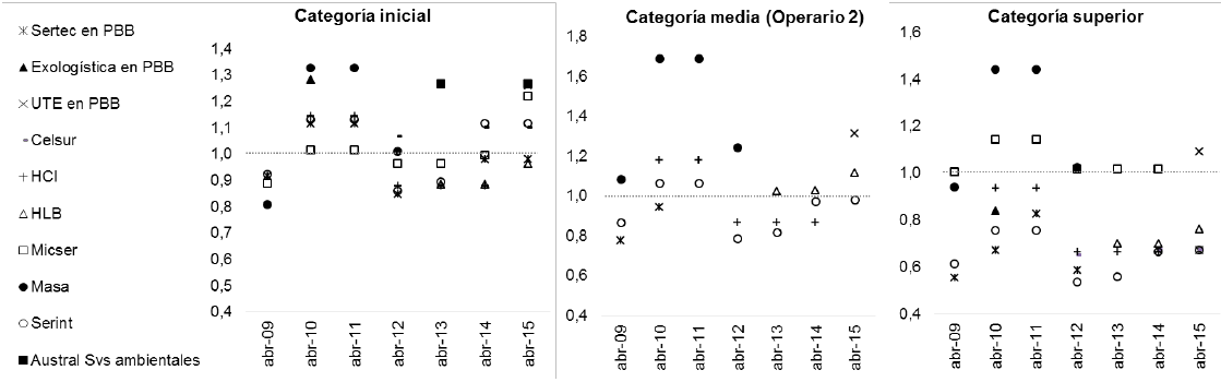 Contrario a lo que podría esperarse a partir de la literatura sobre subcontratación, los salarios básicos en las empresas contratistas no son siempre inferiores al salario básico en la empresa principal. En particular, al comparar las categorías iniciales vemos que en varios años en Indupa (2010-2013) y en PBB (2010, 2011 y 2015) la mayoría de las empresas contratistas tuvieron salarios superiores a la empresa principal.