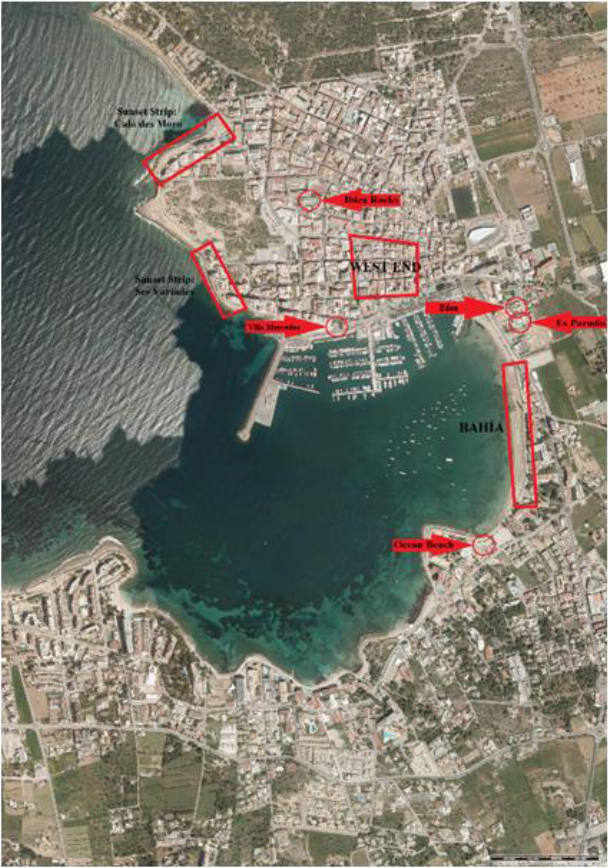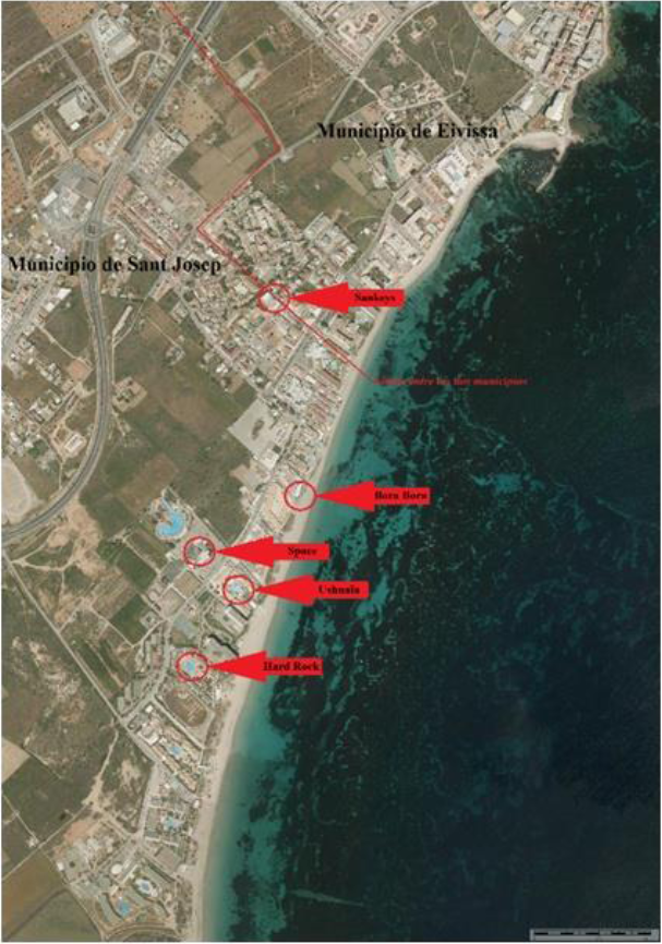 Aunque una parte de la playa se encuentra dentro del municipio de Eivissa, la mayor parte de la playa y la totalidad de la oferta de ocio nocturno se encuentran en la parte perteneciente al municipio de Sant Josep. Las diferencias urbanísticas y normativas entre los dos municipios son muy importantes y visibles. La permisividad de Sant Josep ha hecho que, al desarrollarse, la oferta de ocio nocturno se haya concentrado en su parte de la playa ( Figura 3).