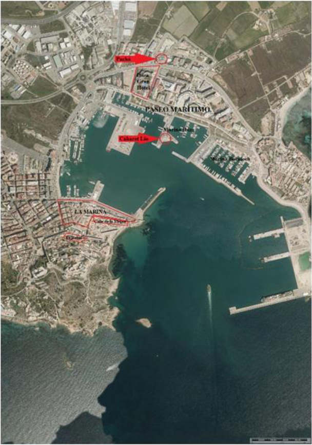 A finales de los cincuenta la situación mejoró significativamente gracias a acontecimientos como la apertura del aeropuerto de Es Codolar (1958) y los cambios en la economía española (1959). El resultado es que, con la apertura del Domino (1959) se inicia la creación de la oferta comercial y de ocio del puerto de Ibiza. A finales de los sesenta ya se encontraba consolidada esta oferta y ha vivido pocos cambios significativos desde los años ochenta. En 1973, con la apertura de la discoteca Pachá en una casa del Prat, al otro lado de la bahía, se inició la actividad de ocio en lo que a partir de los ochenta sería el Paseo Marítimo de Ibiza. Con las sucesivas construcciones y modernizaciones de la zona, el Paseo Marítimo ha llegado a la actualidad siendo el epicentro del turismo de lujo en la isla. En el siglo XXI la oferta de ocio nocturno de la capital se divide entre la ciudad histórica (La Marina, SaPenya y el Rabal de Dalt Vila) y el Paseo Marítimo ( Figura 2):