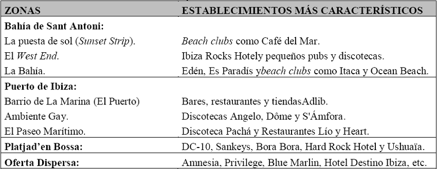 La apertura de la discoteca Space por Pepe Roselló en 1989 inició la transformación de una zona tradicionalmente de turismo de sol y playa familiar, la playa d’en Bossa, en una zona de ocio nocturno. En los últimos años, hoteles como Hard Rock Hotel y Ushuaïa han incrementado el cambio en la oferta y demanda de la zona, primando la oferta de lujo y el ocio nocturno. Finalmente, las restricciones de los ayuntamientos a este tipo de oferta es fundamental, siendo Sant Antoni y Sant Josep muy permisivos, la ciudad de Ibiza más restrictiva, y Santa Eulària y Sant Joan muy restrictivos en su normativa sobre actividades turísticas, ruidos y otros temas relacionados. El resultado es que en la actualidad hay tres zonas principales de ocio nocturno (Bahía de Sant Antoni, platjad’en Bossa y puerto de Ibiza) y algunos establecimientos dispersos situados principalmente en los municipios de Sant Antoni y Sant Josep ( Tabla 1).