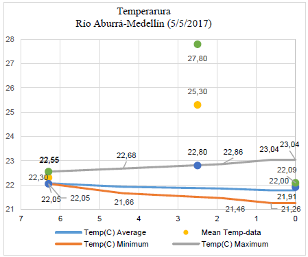 En algunos procesos industriales se requiere elevar la temperatura del agua. Si el agua residual es vertida en estas condiciones se producen efectos adversos a la vida acuática de los cuerpos de agua receptores, cambios en los coeficientes de transferencia de masa y en la concentración de oxígeno. La gráfica 2 representa la simulación realizada por el programa QUAL2K para la temperatura en el río Aburrá, específicamente en el tramo comprendido entre las estaciones de Niquía y de Ancón Norte. Según los reportes de las estaciones, la temperatura media del agua para el río es de 22,5 °C; el resultado reportado para el vertimiento fue una temperatura media de 25,2 °C.