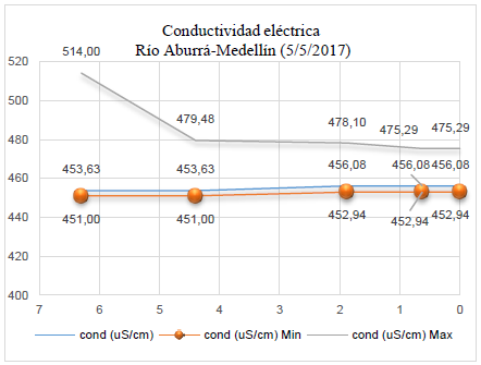 La conductividad eléctrica es una variable que está directamente relacionada con la cantidad de sólidos disueltos totales. En la información de conductividad entregada por la empresa de 31.940 µs/cm; sin embargo, el caudal que ingresa a la fuente superficial es inferior al caudal del río reportado en la estación de Niquía, por lo tanto, ingresa al volumen de control, lo que significa que posteriormente es diluido en el cauce, como se muestra en la gráfica 3. El objetivo de recuperación del río establece para este parámetro que el vertimiento debe tener una conductividad menor a 120 µs/cm, pero actualmente el río no cumple con estas características. En la simulación se muestra como en la estación Ancón Norte no hay cambios significativos en la conductividad, los últimos kilómetros el valor se estabiliza en un valor de 456 µs/cm.