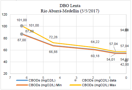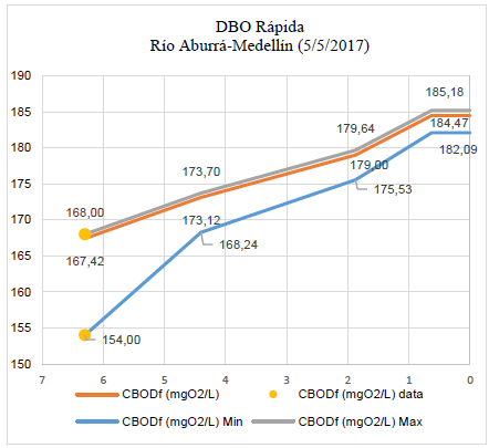 El modelo muestra que después del vertimiento la pendiente de este parámetro se vuelve más pronunciada. La grafica 4 muestra la afectación producto de la descarga de materia orgánica de la empresa al río, debido al aumento de la concentración, A mayor valor de DBO, mayor es la contaminación del agua [18]. Cabe resaltar que cuando el cauce del río se acerca a la estación de Ancón Norte aproximadamente a 0,7 km aguas arriba de esta la DBO5 presenta un comportamiento constante de 185 mgO2/L, lo cual demuestra la estabilización de la carga en este punto. El parámetro DBO5 en el tramo de estudio está por encima del límite establecido por los objetivos de calidad de 5-10 años para este recurso hídrico, en la Resolución 2016 del Área Metropolitana del año 2012, debido a que su valor debe ser menor a 50 mgO2/L.