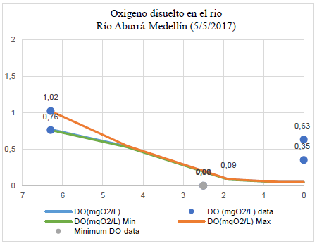 En la información de la concentración de oxígeno disuelto incluida en la modelación, los niveles más bajos de oxígeno disuelto del río se presentan en la gráfica 6, a los 6,3 km entre las dos estaciones, es posible que la carga orgánica de la empresa reduzca el oxígeno a los 2,5 km.