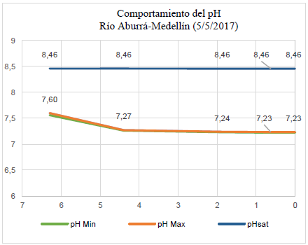 El pH es un parámetro químico indicador de la calidad del agua que muestra la cantidad de hidrogeniones (H+) que posee el agua y puede afectar la vida de animales y plantas acuáticas. El pH en la salida de la PTARI arrojó valores entre 6,88 y 8,66 unidades de pH. El valor máximo está por fuera del rango de los límites establecidos en los objetivos de calidad del agua de la Resolución 2016 del Área Metropolitana. En la gráfica 7 se puede observar que una vez se realiza el vertimiento se genera un decrecimiento en el parámetro analizado; sin embargo, también es perceptible que no hay un cambio significativo, a pesar de que el vertimiento presenta un valor elevado, y, por el contrario, tiende a la neutralidad.