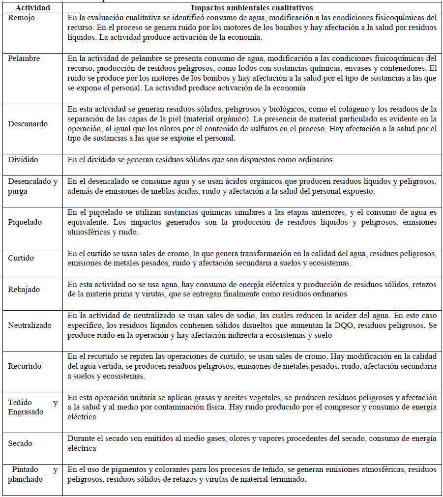 Para el componente agua las actividades de remojo, pelambre, desencalado y purga, piquelado, curtido y recurtido y teñido, los impactos ambientales asociados con el consumo de agua y la modificación de la calidad fisicoquímica del recurso hídrico se valoraron como significativos, por lo cual son prioritarias las actividades de mitigación, prevención y compensación. Para el componente suelo, el impacto valorado como significativo es la modificación de las características fisicoquímicas del suelo, por la producción, el almacenamiento, el transporte y la disposición de lodos y residuos peligrosos que se producen en el proceso y durante el tratamiento de aguas residuales. Dentro de las actividades de mitigación, se deben caracterizar los lodos con el fin de determinar su peligrosidad, cumpliendo con la normativa legal al respecto. Para el aire se determinó que, en las actividades de remojo, pelambre, desencalado y purga se producen olores provenientes de la descomposición de la materia orgánica, proteínas, sangre en las pieles cruda, además del uso de sulfuro de sodio. Pese a que se genera ruido, se tendría que realizar un estudio para determinar si ese ruido supera los límites permisibles; actualmente no hay quejas de la comunidad por emisiones de olores o de ruido. El componente fue calificado como moderado.