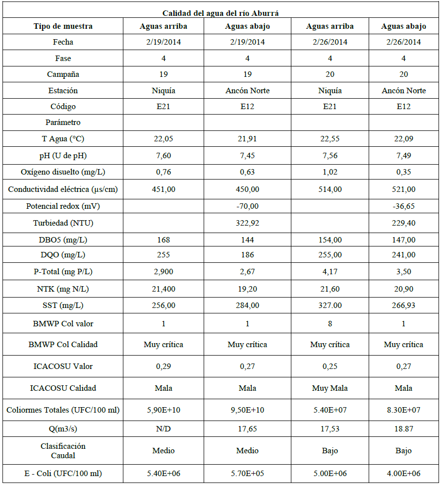 Para la modelación de la afectación por la descarga de desechos líquidos provenientes de una curtiembre al río Aburrá, se tomó información de las estaciones de monitoreo de calidad del agua del área metropolitana del Valle de Aburrá, la estación previa al punto de descarga es Niquía (E21), ubicada en el municipio de Bello. La estación posterior al punto de descarga es Ancón Norte (E12), ubicada en el municipio de Copacabana. La distancia de separación entre las estaciones es 6,3 km en el cauce del río; el punto de vertimiento de la empresa se encuentra ubicado a 2,5 km de la estación Ancón Norte. La información de calidad del agua del río Aburrá, relacionada en la tabla 2, corresponde a las fechas 19 de febrero de 2014 y 26 de febrero de 2014.
