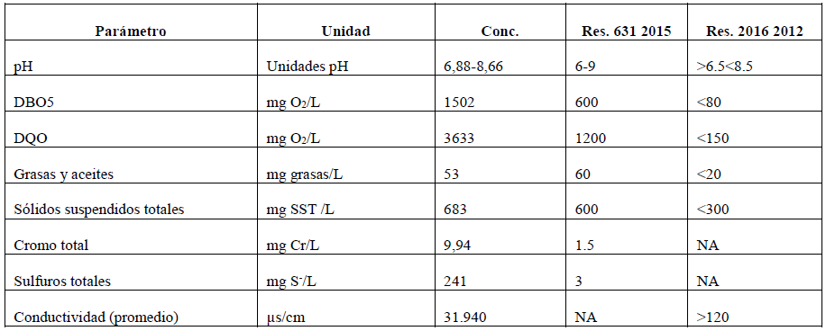 Los resultados de la caracterización fisicoquímica del vertimiento en los parámetros son los siguientes: pH analizado por método SM–4500 H+ electrodo selectivo; DQO por reflujo cerrado SM-5220 D; DBO5 por Método Winkler; electrodo selectivo de O2 SM-5210 B SM– 4500 O G; grasas y aceites por extracción Soxhlet– Gravimetría SM–5520 D: sólidos suspendidos totales por gravimetría SM–2540 D; cromo total espectrofotometría de absorción atómica SM 3030H -3111D, y sulfuros por yodometría SM-4500 S2—F, que fueron suministrados por la empresa, y el análisis de calidad del agua fue realizado por un laboratorio acreditado por el Ideam.