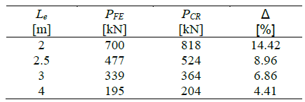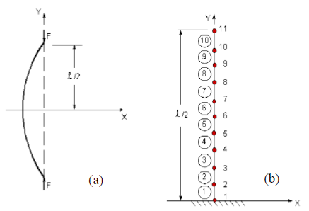 A finite element model of the column was developed using ANSYS [7]. Beam type elements BEAM23 of the ANSYS library [7] were used for the discretization of the domain, and only half of the column was modelled due to symmetry in the geometry and in the boundary conditions (Figure 1). Moreover, in order to properly characterise the modal shapes of the buckling problem, a total of 10 elements were used. Additionally, the material has an elastoplastic behaviour, and the nonlinear response of the column was traced employing the modified Riks method [8].