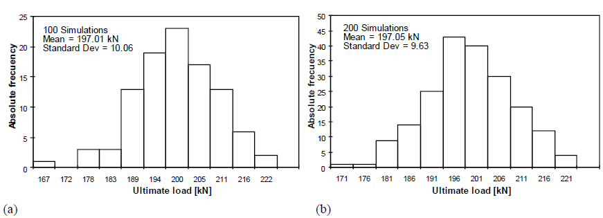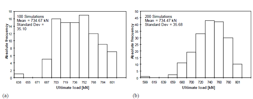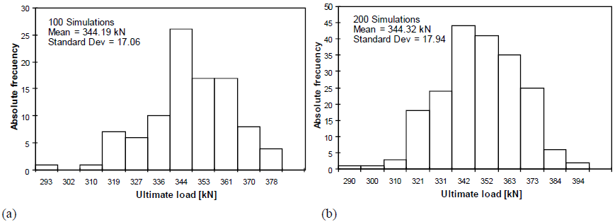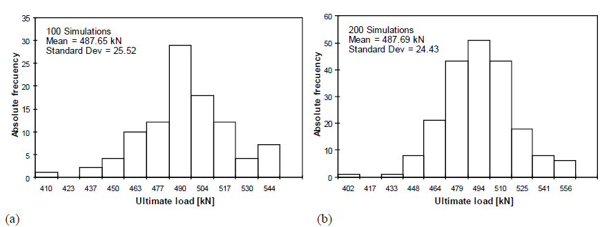 With the definition of the probabilistic model, a series of nonlinear finite element analyses were carried out in conjunction with Monte Carlo simulations to obtain the statistical data corresponding to the load capacity of the column and, then, evaluate its sensitivity to the input parameters (Table 2). Monte Carlo approach has been proven superior to other approaches for large variations of the stochastic parameters. The number of simulations needed within a Monte Carlo analysis to obtain a stable output of the results depends to a large extent on the variability of the input data. [12, 13].
