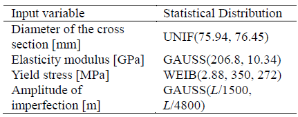 The random nature of the geometrical properties and the material of the compression member studied is considered when regarding these properties as probabilistic variables with known statistical distributions. Indeed, the variability of the yield strength and modulus of elasticity of the hot-rolled AISI 1035 steel was obtained from reference [10]. Moreover, the variability in the cross-section of the column is expressed through manufacturing tolerances of the diameter of the cross-section as indicated in the AISI manual [11]. Additionally, the initial curvature of the structure is modelled according to Eq. (1) with a wi amplitude given by a Gaussian distribution. Table 2 summarises the statistical characteristics of each random input variable. In this table, the term GAUSS denotes a normal distribution with a mean value and a standard deviation as statistical parameters, the term WEIB indicates a Weibull distribution of three parameters, and UNIF represents a uniform distribution characterised by its lower and upper bounds.