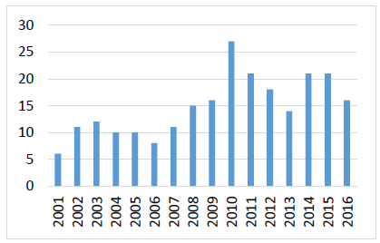 The study of the relations between R&C becomes visible to the academic community since 2001, this is contrasted in two databases (WOS and Scopus), verifying that in previous years a maximum of two articles per year were published, making the period 2001 – 2016 of feasible study. Figure 1 present the number of publications per year, there is evidence that in 2001 only 6 articles were published in the WOS, a figure that increased in the following 15 years, however, its growth did not keep a clear trend. The largest number of studies was concentrated in 2010, when 27 documents were published. Between 2014 and 2015 the number of publications remained stable, while in 2016 there was again a decrease.