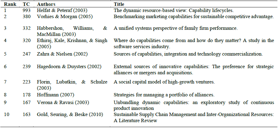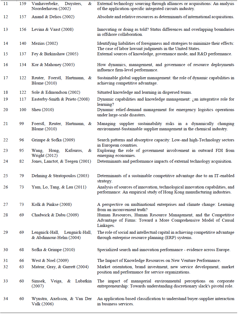 The most relevant article has received 993 citations, it was published in 2003 by Helfat and Peteraf, and is entitled: The dynamic resource-based view: capability lifecycles. It should be noted that the documents found indicate different internal and external sources that generate capabilities, study the relationship between resources and capabilities, the influence of resources on capabilities and analyze the relationship of some type of resource or capacity with competitive advantage or performance of the company. Complete trends are shown in Table 9.