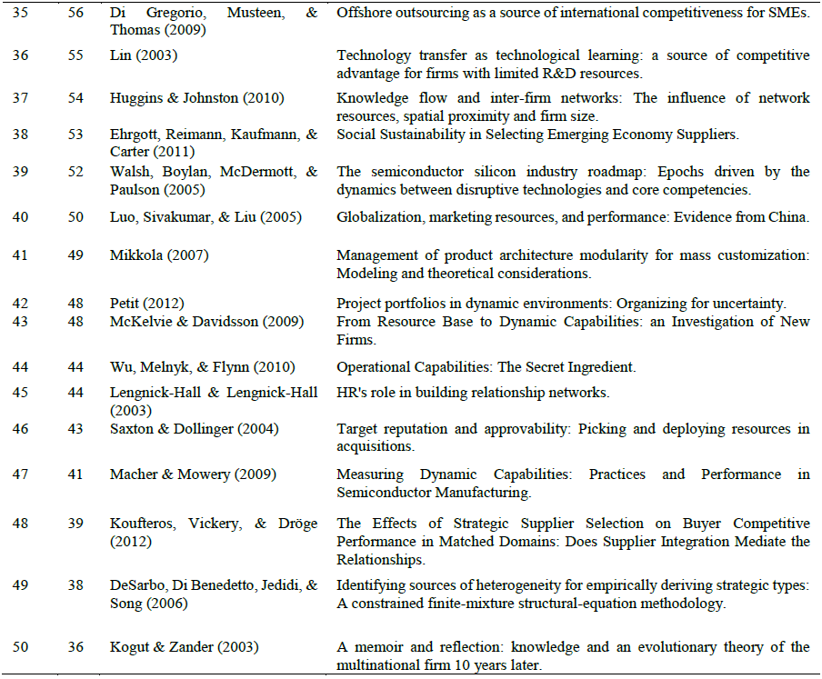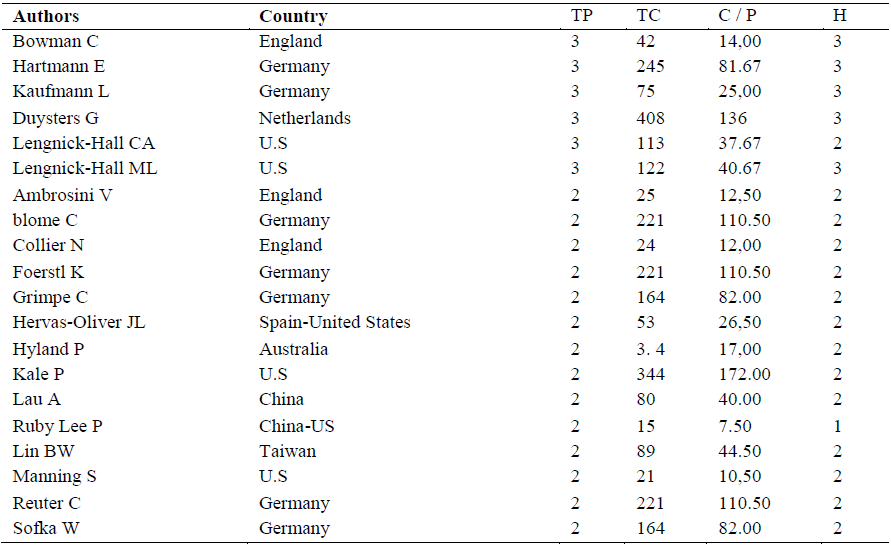 Table 7 presents the countries where the authors executed their research activity, together with their bibliometric indicators. The first six authors (Bowman Cliff, Hartmann Evi, Kaufmann Lutz, Duysters G, Lengnick-Hall CA and Lengnick-Hall ML) have 3 publications each. Although they are the most productive, it is still a small number compared to studies that analyze the impact of resources and capabilities on competitive advantage (these reach, for example, 3,187 documents in the WOS). On the other hand, the most productive authors do not necessarily have the most citations, the analysis reflects that authors with lower productivity are positioned with a high number of citations as in the case of Duysters, G (408 citations), Kale Prashant (344 citations) and Hartmann Evi (245 citations). It should be noted that for this analysis the number of academics working in the European continent more precisely in Germany is remarkable (p.e. Table 7).