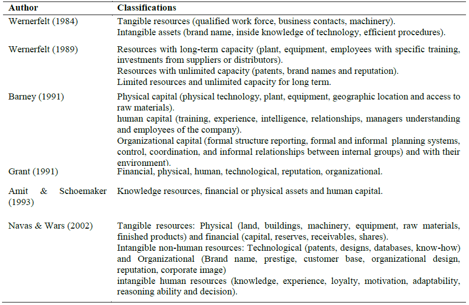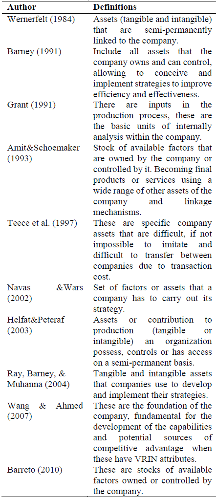 In the literature, numerous studies are identified on the importance of resources for companies in the development of their economic activity [21]. In fact, historically they have generated numerous definitions and classifications; perhaps the most influential is its conception as tangible and intangible assets, which are semi-permanently tied to the company and are controlled by it [5], [10], [11], [20]. Some authors argue that these assets are specific to the company, so it is difficult to imitate them or transfer trade secrets and specialized production facilities [22]. Similarly, Grant (1991) defines resources as inputs used in the production process and, the basic units of analysis, since they represent both the foundation of the company and its capabilities [12]. Table 1 shows a historical set of the different conceptions of the term "Resources".