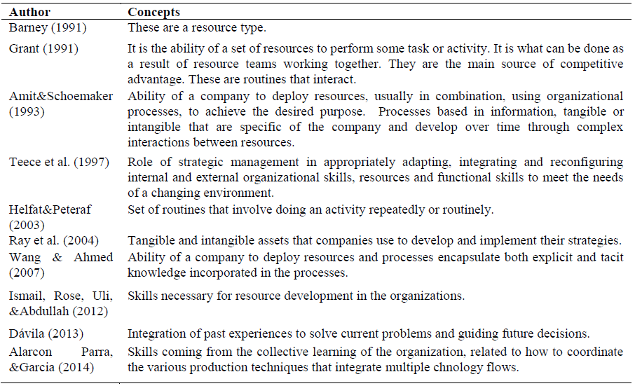 Several experts agree that the capabilities are different constructs integrated in the companies to generate competitive development, there is a set of skills and knowledge of a company to deploy a team of resources working and interacting together achieving a desired end [1], [12], [18]. For example, Teece et al. (1997) argue that the term refers to the key role of strategic management in adapting, integrating and reconfiguring internal and external organizational skills, resources and functional competencies to meet the needs of a changing environment. However, they have been defined as a set of routines that imply the stability and repeatability of the behaviors and processes of an organization [1], [2], [28], [30], [31], this indicates that for the execution and development of a capability, a process of integration and combination of resources is required and its effectiveness will be achieved through repetition, becoming routine [1], [25]; therefore, a routine is necessary for operational efficiency [24] and the creation of tacit knowledge [28], [32]. Scholars who have addressed the issue suggest that the traditional conception of routines applies to relatively static, stable or predictably changing environments, whose process relies on existing knowledge [12], [24], [25]; In contrast, for high-speed exchange environments, a distinctive type of capability is required to respond to the dynamism of the market, these are called dynamic capabilities and they are based on the generation of new knowledge [11], [12], [23], [25], [33]. Table 3 presents different conceptions of the term capabilities over time.