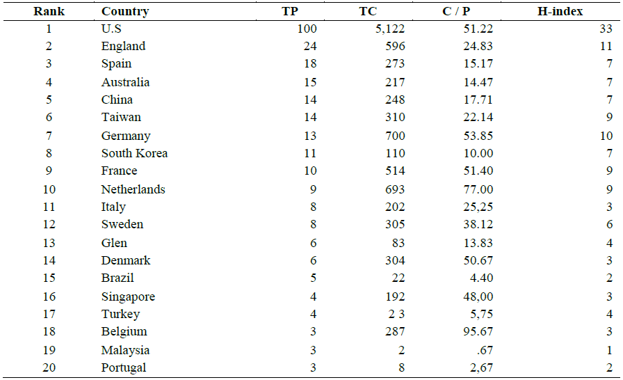 Productivity is valued through the number of published research articles (TP), the total number of citations received per published article (TC), the average citations per published article (C/P) and the H index that measures the quality of research production based on the number of citations received. Table 5 contains the 20 countries with the highest productivity in the subject under study. The United States ranks as the country with the highest number of publications (100 documents) with the highest number of citations (5,122) and the highest H index (33), however, the average citations per article is led by Belgium with 95,67, data that is interesting because it only counts with 3 publications; which could reflect the quality of their studies. The position of the United States may be due to factors such as the investment that the country devotes to research and the better access to scientific journals and databases by its academics compared with theoreticians from other nations. England and Spain occupy the second and third position with 24 and 18 studies respectively. Belgium, Malaysia and Portugal have the same number of publications, however, Belgium has a number of average citations per article and the highest H index.