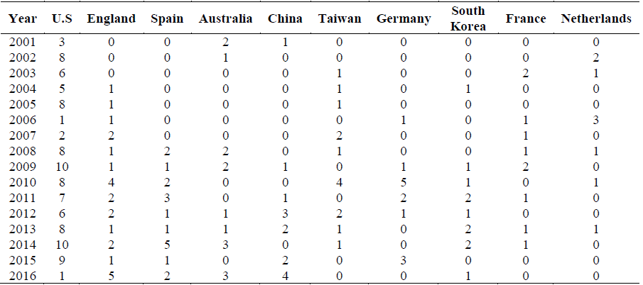 Table 6 shows the number of studies published in the ten most productive countries between 200-2016. It is evident that the majority of articles visible in the WOS were published in the United States; however, during 2016 this figure significantly decreased, while in England, China and Australia increased (p.e. Table 6).