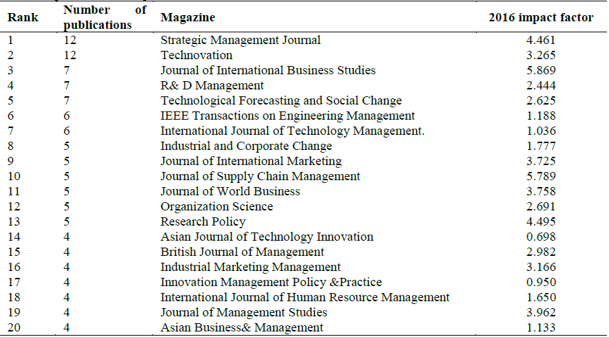We identified 102 journals that published articles exploring the relationships between resources and capabilities. Table 8 presents the most productive journals in this sense together with its impact factor (used to know the importance of a journal within a research area). The two journals with the highest number of publications are: Strategic Management Journal and Technovation, with 12 documents each. Subsequently, three journals with 7 publications each are placed, among them: Journal of International Business Studies, R & D Management and Technological Forecasting and Social Change. Although most publications focus on certain types of journals, it does not mean that they have the highest impact factor (p.e. Table 8).