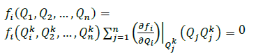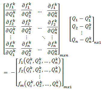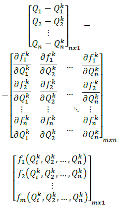 Suponga que los caudales de un sistema de tuberías están representados mediante la formulación observada en la ecuación 11, el cual no es lineal y sus variables pueden ser aproximadas inicialmente como se muestra en la ecuación 12.