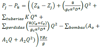 (7)Para sistemas complejos de redes de tuberías, donde existen fuentes múltiples, y diferencias en la elevación, la ecuación 6 debe ser acondicionada para considerar dichos efectos (véase ecuación 8).