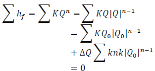 (5)En la cual, Δ𝑄 es asumido de igual manera para todas las secciones de tubería en un bucle. Las anotaciones de valor absoluto se han añadido para tener en cuenta la dirección de la sumatoria alrededor de un bucle dado. La ecuación 6 permite obtener Δ𝑄.