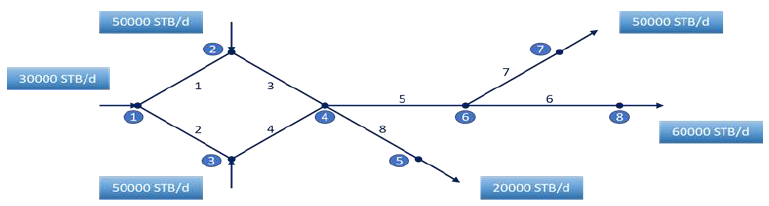 En este estudio, el modelo fue probado usando varios datos hipotéticos de una red de tuberías. Con el fin de verificar la validez de los resultados obtenido, estos fueron cotejados con los alcanzados por Tian y Adewumi [3]. La evaluación de los resultados es bastante simple, ya que las variables hidrodinámicas deben tener valores simétricos en la red propuesta. Los resultados de la predicción muestran que el modelo es capaz de predecir con gran precisión tanto la distribución de las presiones y flujos en cada nodo como el hold-up de líquido en cada tubería y el régimen de flujo, con la ventaja de tomar en cuenta una fase líquida compuesta no solo por un tipo de fluido (i.e. aceite) sino por dos fases inmiscibles (agua y aceite). Es de aclarar que el modelo propuesto es independiente a la calidad del crudo, tipo de fluido e inversiones de fases de mezclas agua-aceite, y de fenómenos tales como la corrosión [26], los cuales deben ser modelados por medios de correlaciones de fluidos para instancias Black oil, por lo tanto, la implementación del modelo planteado no está limitado por lo anteriores.
