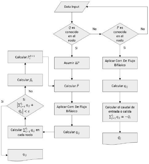 Una vez terminada la fase de identificación se procede a calcular las presiones y caudales correspondientes a cada tubería de manera simultánea, usando los modelos de flujo tratados previamente, para posteriormente determinar las presiones y caudales en cada nodo mediante el modelo de red. La implementación del procedimiento iterativo es explicada detalladamente en el diagrama de flujo mostrado en la figura 2.