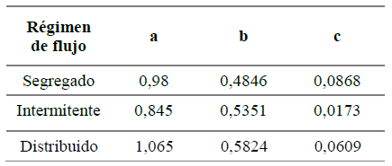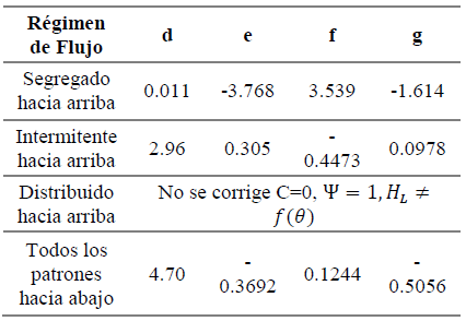 12. Calcular el hold-up para tubería horizontal mostrado en la ecuación 50, usando las constantes de la tabla 1: