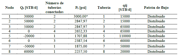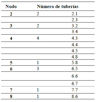 Para iniciar el análisis del sistema la entrada de datos debe constar de tres componentes: 1) el número total de nodos y el número de tuberías conectadas a cada uno; 2) las propiedades del fluido y de las tuberías, y finalmente, 3) las presiones o flujos conocidos. A continuación, en la tabla 3 se encuentra un resumen de la relación existente entre los nodos y las tuberías del sistema.