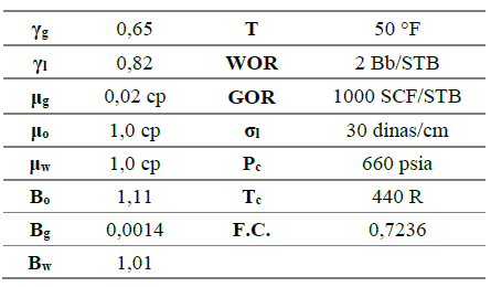 Es importante aclarar que las propiedades de los fluidos transportados (i.e. aceite, agua y gas) deben ser calculadas mediante las correlaciones adecuadas; no obstante, valores constantes fueron asumidos para la fase líquida (i.e. agua y aceite) y la fase gaseosa, con el fin de agilizar el análisis, tal y como se muestra en la tabla 4.