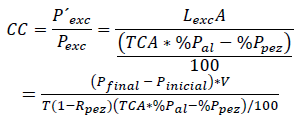 A la par, sea Lexc el flujo de entrada del fósforo excedente (kg de fósforo/ (m2 año)) y Rpez la fracción de fósforo proveniente de los cultivos piscícolas, pérdida en los sedimentos [13]. El valor límite de Pexc se estima a partir de la concentración máxima admisible de fósforo posterior a la cosecha Pfinal, así como de la concentración de fósforo promediada en la columna de agua en momentos previos al inicio de toda actividad de piscicultura, Pinicial; por lo que [4] propuso estimar la producción de biomasa o capacidad de carga anual (CC), a partir de la razón entre la rapidez de entrada del fósforo excedente (Pexc /año) con el descargado al sistema producto de los cultivos (Pexc/Tonelada de pez producida), donde Pexc es obtenido a partir del fósforo que entra como alimento, así como del que sale como biomasa, todo esto según la ecuación (9) [15]: