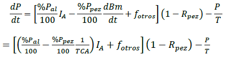 (8)2. El sistema está en estado estacionario (P y L constantes), por tanto, P’sale = P’entra. Teniendo en cuenta que V = Az, con z la profundidad media del cuerpo de agua (m); L, el flujo de entrada de fósforo al sistema (kg/(m2*año)); A, el área superficial del cuerpo de agua, (m2) y V, el volumen del cuerpo de agua (m3); la concentración de fósforo también proviene del alimento no ingerido, así como de los excrementos de los individuos (P excedente: Pexc).