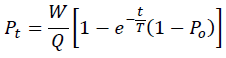 Los parámetros que definen la ecuación de [21] son los siguientes; Q = Qe + Qd = Caudal de salida del sistema = Caudal de entrada + Caudal de descarga neto (corriente, lluvia, evaporación); W = QeCe + QdCd = Masa total del contaminante que entra, Ce = Concentración de entrada; Cd = Concentración de entrada o salida de una descarga, Cm = Concentración resultante de la mezcla; T = Tiempo de retención hidráulica (mide la relación en horas entre el caudal y el volumen del depósito de aireación); K = Velocidad de degradación del contaminante, y Co = Concentración inicial de contaminante. A través de los años la concentración que existe, Cm, va igualándose a la concentración que entra. Se dice entonces que se ha alcanzado una concentración de equilibrio, lograda al cabo de tres años.