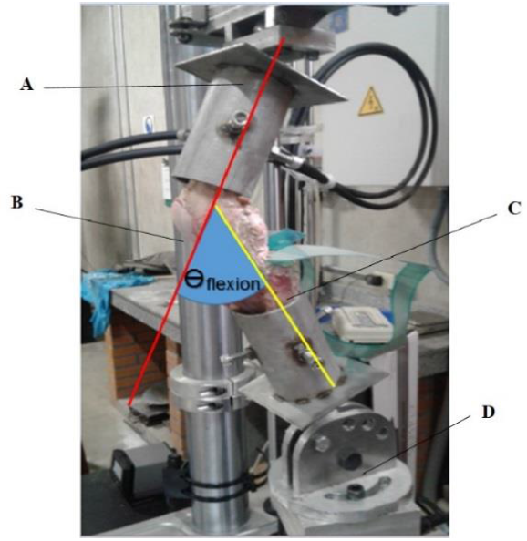 Seven pig knee joints, with an age of 4 months average, were obtained from a slaughterhouse. The dissection process was made taking care on preserving all soft tissue surrounding the articular capsule. About 15-cm above and below the knee join were harvested. Then, the proximal femur and distal tibia were potted with resin in a 5-cm PVC pipe to facilitate on fixing the specimen to the 6-DOF device which allowed to obtain the knee flexion angles (see Figure 1). The femur attaches to a cylinder which has a ball joint allowing rotations on the three planes, and the tibia potted goes into a cylinder which distal end allow rotations on the sagittal and transversal planes. The specimens were wrapped in saline soaked gauze and frozen at -18 °C. On the day of testing, the samples were thawed at room temperature (26 °C on average) for 4 hours. The knees were sprayed each 15 minute with a saline water solution to preserve the joint moisture during the test. Healthy knees were tested, and contact properties obtained. Subsequently, ACL of each knee was subjected to rupture by hyperextension. A small device was built to keep the femur fixed while a load was applied on the posterior side of the tibia until the ligament failed by excessive anterior tibial translation. This is a type of injury which is common in athletes who practice high contact sports like football or soccer [30]. After the test, all knees tested were explored inside to determine if menisci or other tissue tear as well.