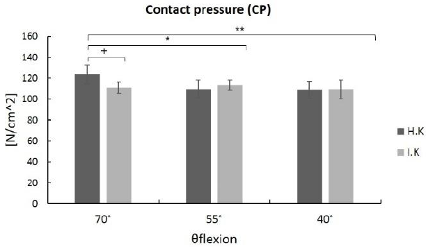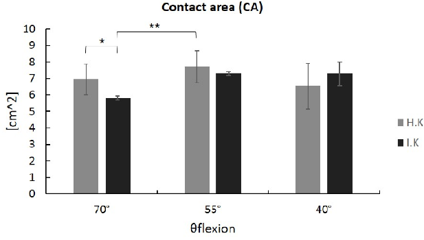 On the other hand, significant differences were found on HK and IK at 70o, and IK-70o and HK-55o. CA (Contact Area) on healthy knees increased 10% from 70o to 55o and then decreased 18% from 55o to 40o. On the contrary, IK slightly increases as angle decreases. In addition, no significant differences were found between HK and IK for 55o and 40o flexion angles.