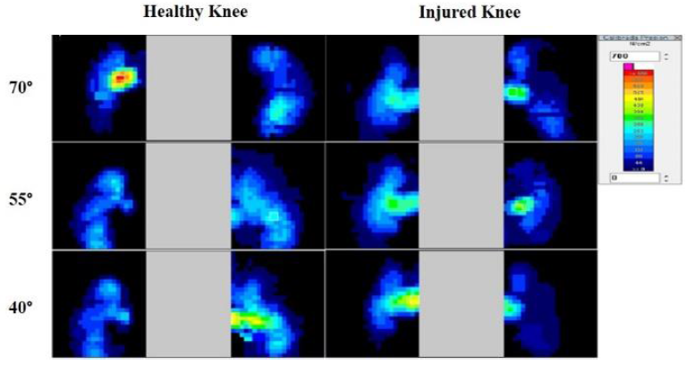Contact properties were measured for Healthy (HK) and Injured Knees (IK). Significant differences were found between a HK-70 and IK-three angles for Contact Pressure (CP). Interesting results are shown in Figure 2, there are a decreasing in 12% in CP from HK to IK at 70°, an increasing of 33% at 55o, and only an increasing of 5% was observed at 40°. The patterns of the sensors (Figure 3) showed a similar tendency to that shown in Figure 2. After the ACL induced injury, a decreasing for largest flexion angle (70o) and an increasing for the remaining two angles (55o and 40o). Moreover, healthy knees increase their CP as flexion angle increases as well.