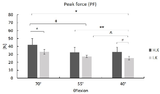 PF (Peak force) in HK are higher than IK at the three angles tested in a range of 18% to 32%. Peak force diminishes as flexion angle decreases in both healthy and injured knees. However, it seems there is no change for PF in HK at 55 and 40. ANOVA showed that in most of the cases a significant difference was found when a HK is compared with a IK (p < 0.05).