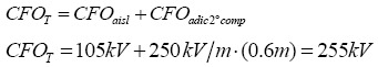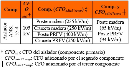 (1)Los términos de la Ecuación (1) cuando se adicionan elementos estructurales como postes y crucetas de madera o PRFV a un aislamiento primario dado por un aislador ANSI 55-4, se presentan en la Tabla 2. Según la norma IEEE Std 1410, los valores de CFO de la Tabla 2 son obtenidos mediante ensayos normalizados en húmedo, igualmente, estos hacen referencia al valor mínimo obtenido entre impulsos de polaridad positiva y negativa. Esta norma informa que los valores de CFO de componentes adicionados al aislamiento primario tienen un 20% de error, así, dada la variedad de materias primas empleadas para la construcción de crucetas y postes de madera o de PRFV, la norma recomienda realizar ensayos de laboratorio para determinar con mayor exactitud estos valores.