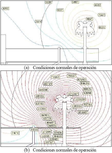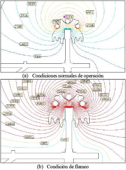 En este caso, la estructura es puesta a un potencial de 0V, dado que es considerada de material conductivo, compuesta por un poste de concreto o de acero, por cruceta y diagonal de acero y por un espigo metálico. En la Figura 9(a) se muestra la distribución de potencial generado en condiciones normales de operación cuando la tensión en el conductor es 10.78 kV, que corresponde al valor pico del valor monofásico nominal de una RD de 13.2 kV. Adicionalmente, la Figura 9 muestra la distribución de potencial cuando la tensión en el conductor alcanza el valor de 96.51 kV pico (68.24 kV rms), valor tomado de la Tabla 3 registrado en el ensayo de flameo a baja frecuencia para la configuración de poste de concreto y cruceta de acero. El camino de flameo que se presenta en una estructura conductiva es el mostrado en la Figura 5, esto es, siguiendo la distancia de arco del aislador (entre el conductor y el espigo). Puede observarse que la línea equipotencial más cerca del espigo, cambia de 714 V a 3490 V en las dos condiciones de la Figura 9.